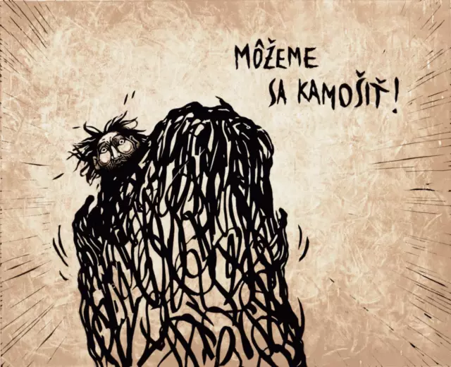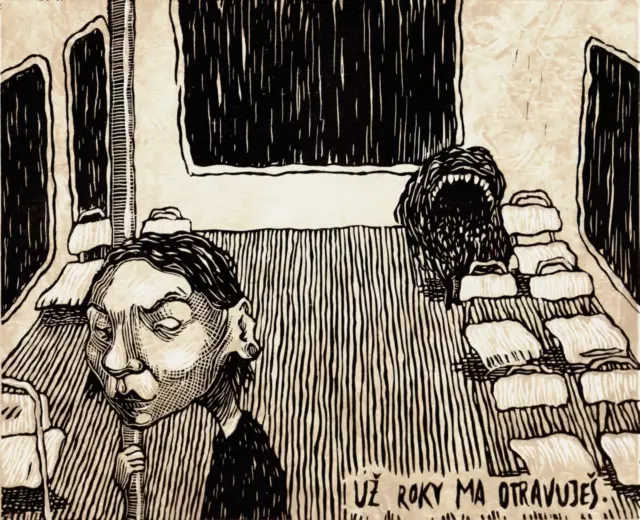 The story comes from my personal experience that stayed hidden here, so everyone can watch his own story based on self-experience. However, the main theme is reconciliation with the past. The book consists of linocut and monotype prints. The name "You again?" is based on the fact that the "monster" character likes unannounced visits, so it's good to find a nice relationship with it.