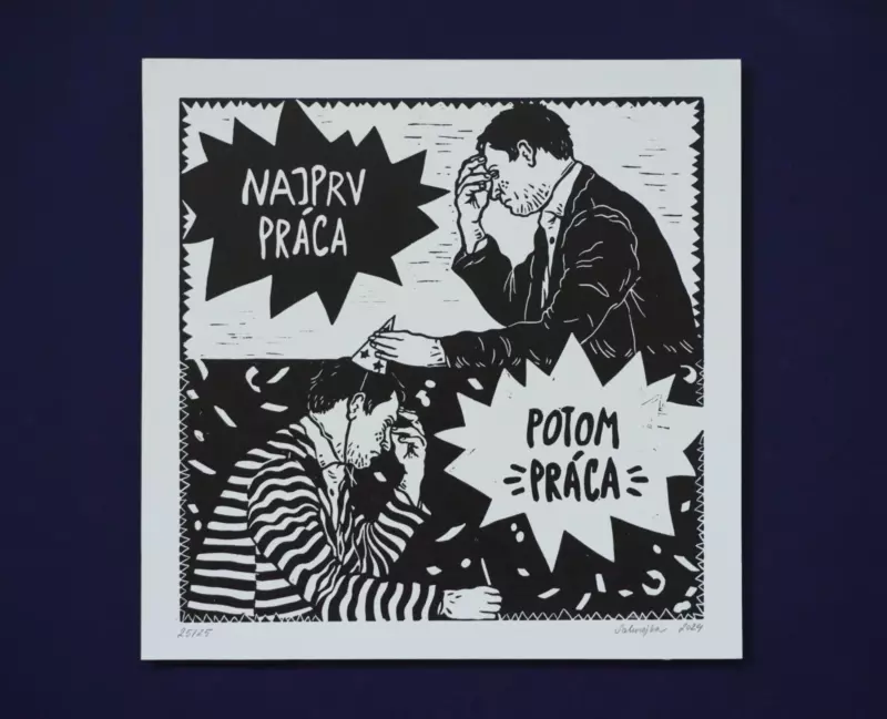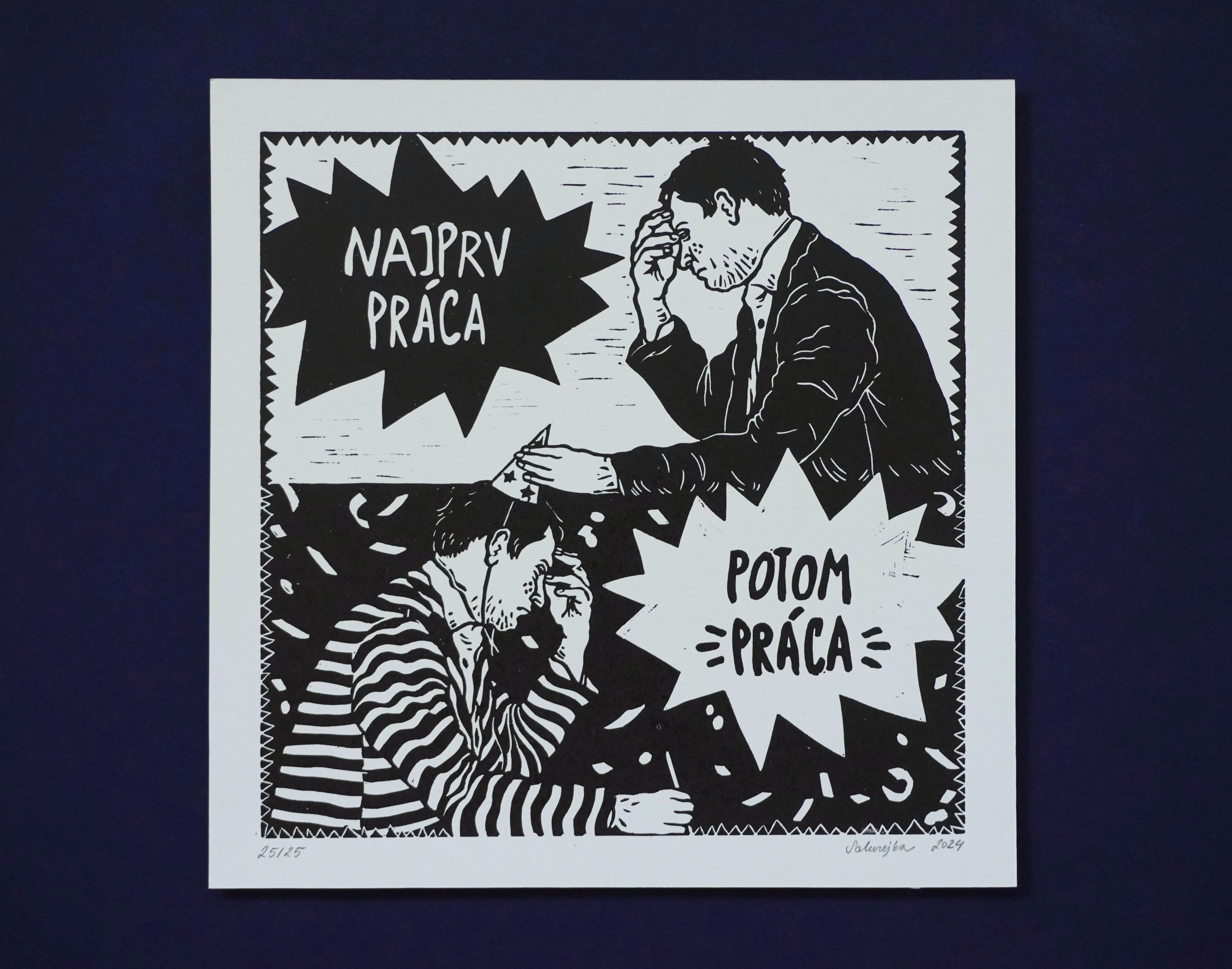 „"Najprv práca, potom práca"“, linoryt, 2024